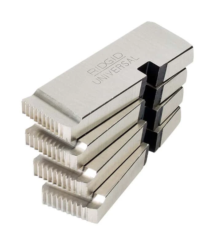 Ridgid 47745 one half inch to three quarter inch NPT (Nominal Pipe Size-Threads Per Inch) dies are compatible in the Wheeler Rex 897065 Universal Die Head and the RIDGID 97065 Universal Die Head. The Die Heads can be mounted onto several different threading machines from either Ridgid or Wheeler Rex. The Dies in the head can be easily changed and if the Die Head is mounted to a machine the Die Head does not need to be removed from the machine for die changes. With 20 mm-wide profiling dies, the load is reduced, which makes it easy on the motor of a threading machine Notches in the dies click into position against spring balls in the die head for easy confirmation the dies are installed correctly Right hand cutting of threads Used in universal die heads Dies are crafted from tool steel Dies can be changed without removing the die head from the machine Dies can be used in several different Die Heads from Wheeler Rex